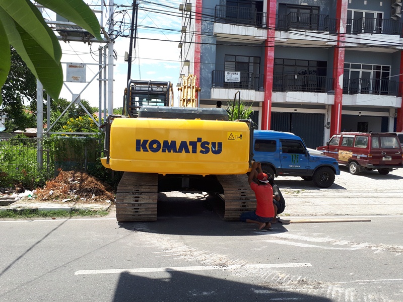 Namun apa pasal, Scavator berek komatsu itu rupanya terlalu besar, sehingga tidak dapat memasuki lorong sempit di samping ruko paling ujung barat. Akibatnya sepotong jalan Moh.Hatta mengalami kerusakan. Aspal badan jalan Moh.Hatta itu terkelupas akibat rantai ban scavator itu.