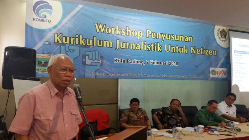 Bang Doel (deadline-news.com)-Padang-Mantan Ketua Dewan Pers Bagir Manan memberi materi dalam workshop penyusunan kurikulum jurnalistik untuk Netizen yang berlangsung di Premier Basko Hotel, Padang, Sumatera Barat, Rabu (7/2-2018).
