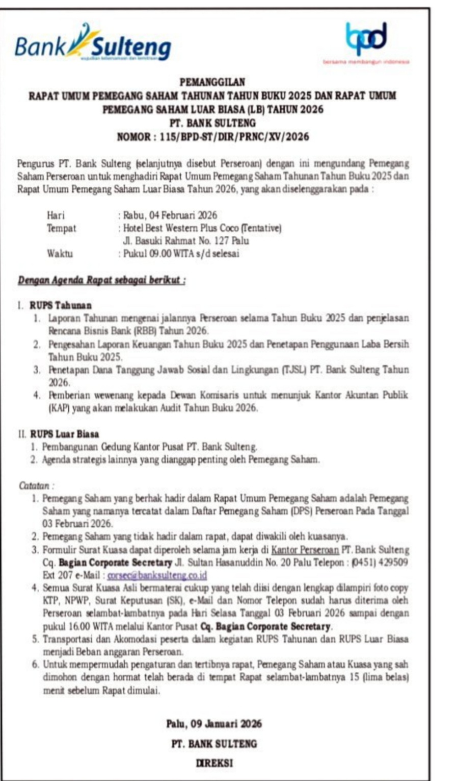 Pemanggilan RUPS tersebut secara resmi ditetapkan di Palu pada 9 Januari 2026 dan ditandatangani oleh Direksi PT Bank Sulteng. Dikutip di readnews.id. ***