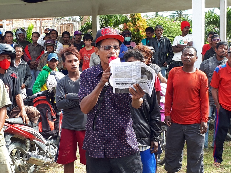 Dengan menggunakan pengeras suara, perwakilan Suku Bunggu Pak Jaya berorasi meminta pihak Lingkungan Hidup Mamuju Utara segera bertindak atas laporan masyarakat terkait dugaan pembuangan limbah yang mencemari sungai.
