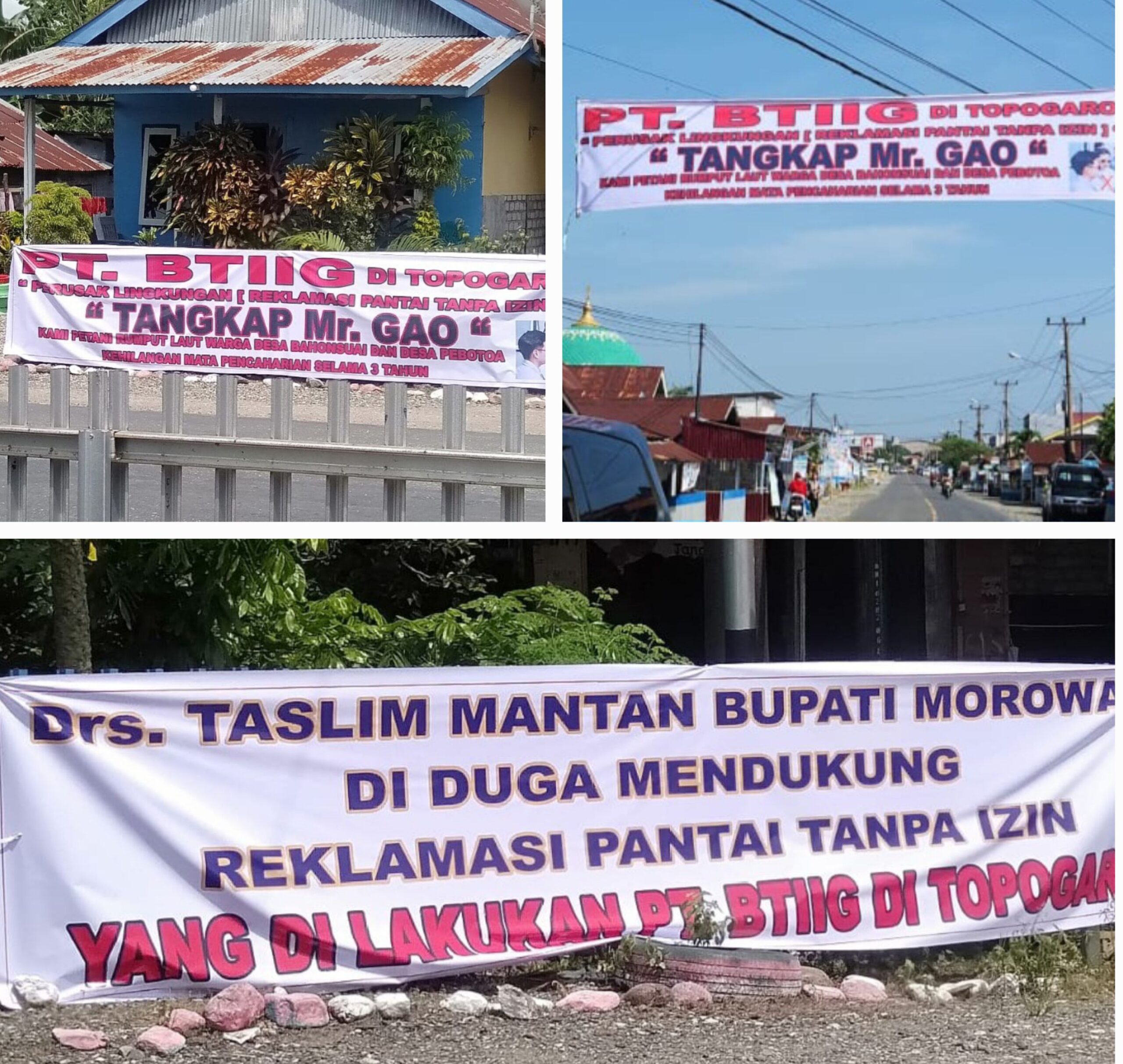 ‘PT. BTIIG di Topogaro perusak lingkungan reklamasi pantai tanpa izin “Tangkap Mr Gao”. Kami petani rumput laut, warga Desa Bahonsuai dan Pebotoa kehilangan mata pencaharian selama tiga tahun’.