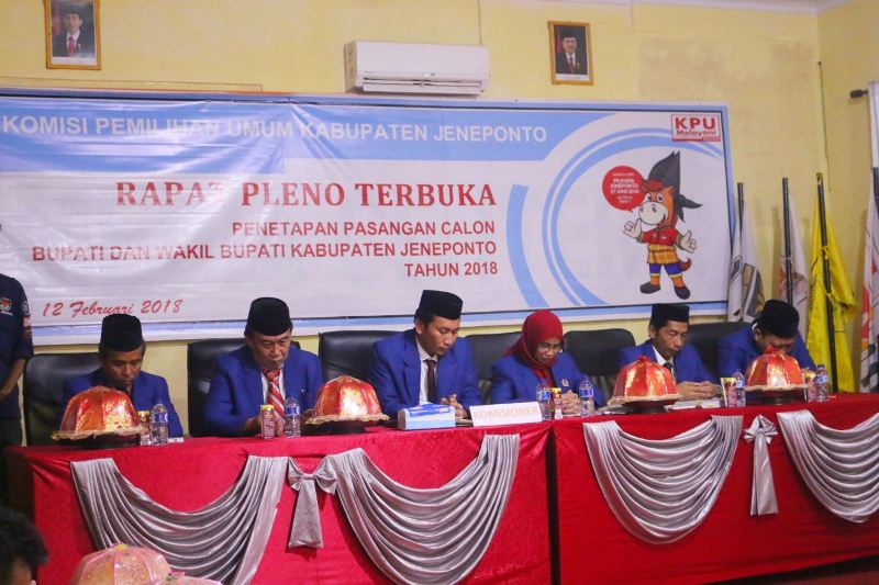 Penetapan pasangan calon Bupati dan Wakil Bupati itu digelar dalam rapat pleno terbuka di ruang media center Kantor KPU Jeneponto, Senin, 12 Januari 2018.