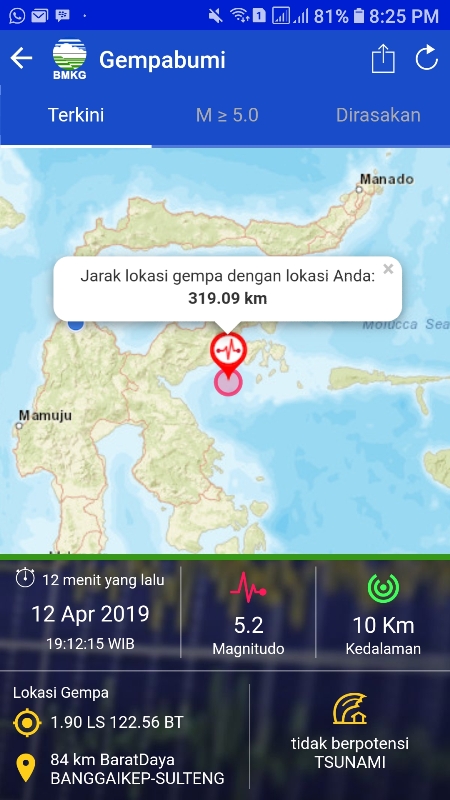 Bang Doel (deadline-news.com)-Palusulteng-Gempa Bumi dengan kekuatan 6,9 magnitudo yang berpusat di kabupaten Banggai Kepulauan (Bangkep) Jum’at malam (12/4-2019), berpotensi tsunami.