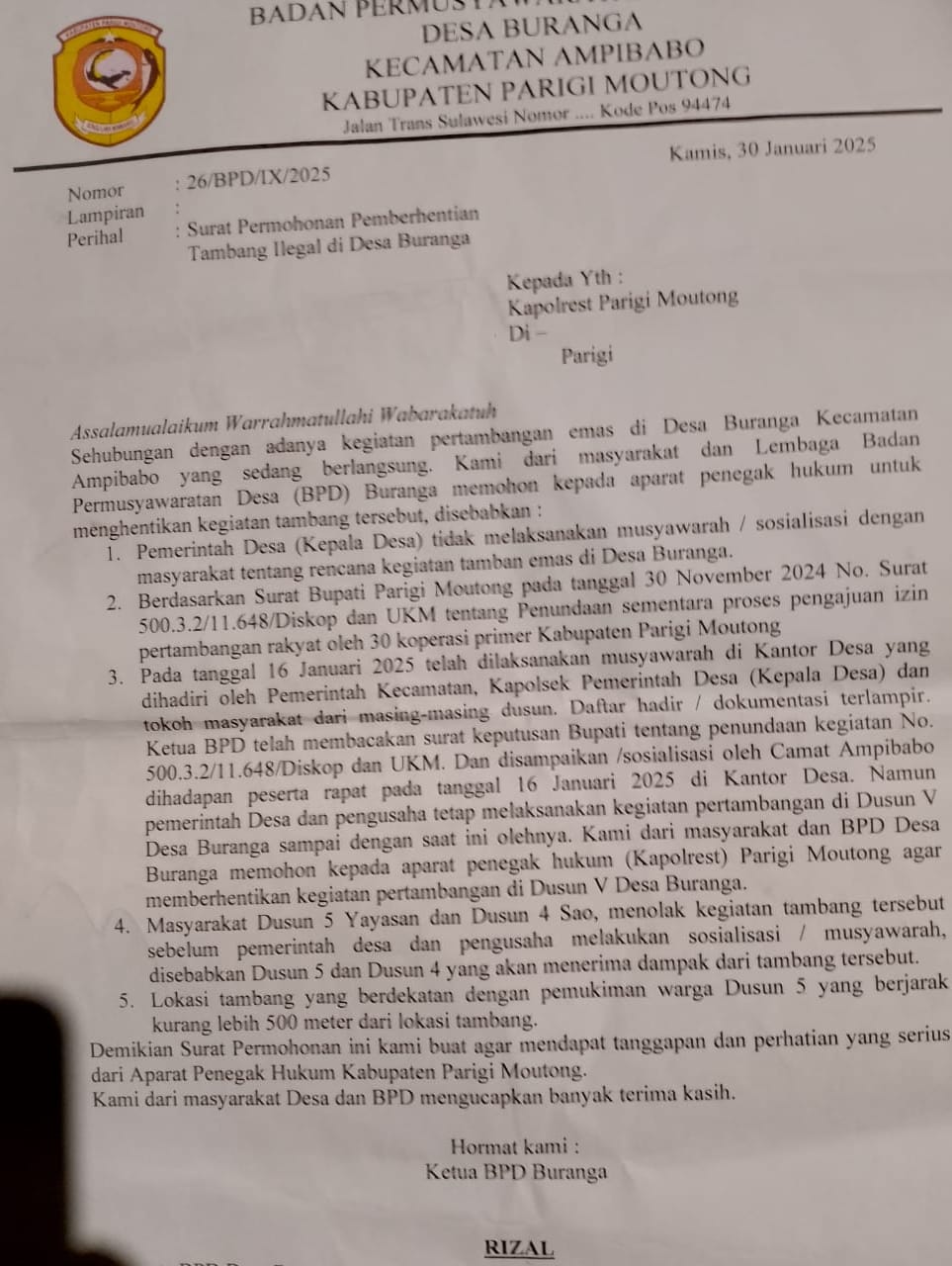 - Bahwa kegiatan upaya pertambangan oleh beberapa Koperasi di Buranga telah resmi mengantongi izin sesuai dengan perundang-undangan yang berlaku yakni; Koperasi Sina Jaya Mandiri mendapatkan IPR dengan Nomor 04082400284440004 dari Dinas Penanaman Modal Perizinan Terpadu Satu Pintu (DPMPTS) Sulawesi Tengah tanggal 8 Januari 2025.Koperasi Sina Maju Bersaudara mendapatkan IPR dengan Nomor 09082400740460001 dari Dinas Penanaman Modal Perizinan Terpadu Satu Pintu (DPMPTS) Sulawesi Tengah tanggal 8 Januari 2025.Koperasi Buranga Baru Indah mendapatkan IPR dengan Nomor 12370005218740006 dari Dinas Penanaman Modal Perizinan Terpadu Satu Pintu (DPMPTS) Sulawesi Tengah tanggal 8 Januari 2025.