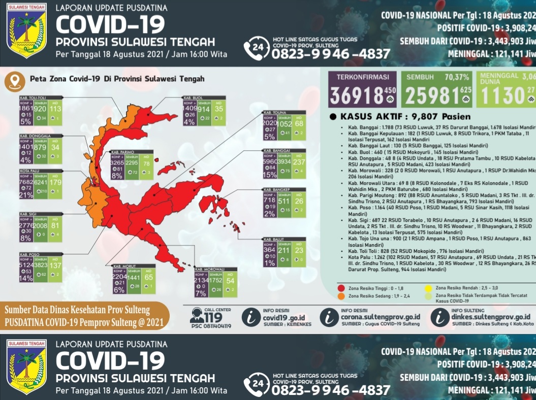Sedangakan yang kasus kumulatif Positip Covid-19 Sulteng mencapai 36.918 dengan ketambahan 450 kasus perhari ini Rabu (18/8-2021), dengan rincian sebagai berikut :