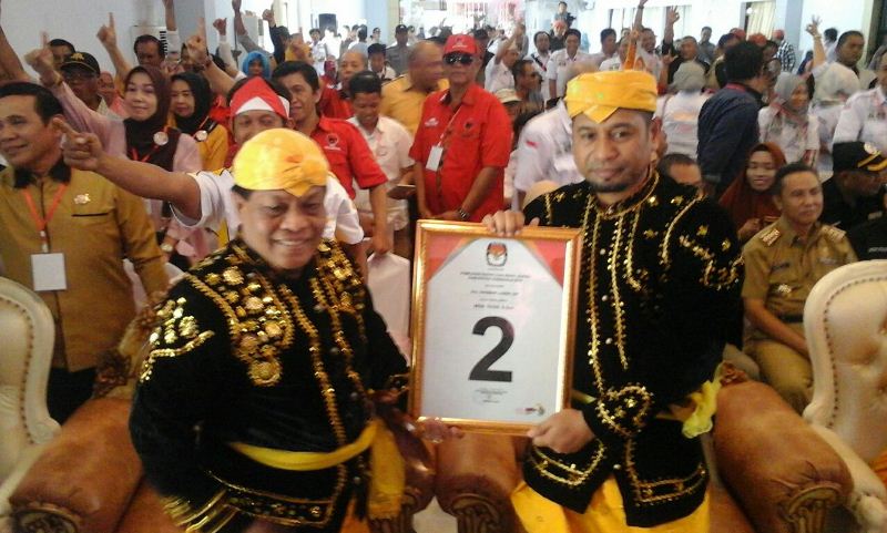 Setelan paslon Kasman-Yasin mengenakan baju adat Donggala berwarna hitam bermotif benang emas dipadukan sarung Donggala melilit dipinggang diselipkan sebilah keris pusaka plus Siga dikepala, keduanya terlihat sangat berwibawa.