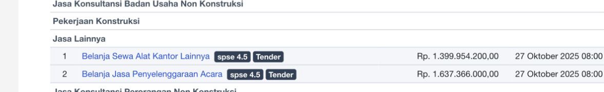 Tender proyek non fisik ini baru saja dilakukan pada 27 Oktober 2025. Demikian informasi yang dihimpun media ini Minggu (26/10-2025).