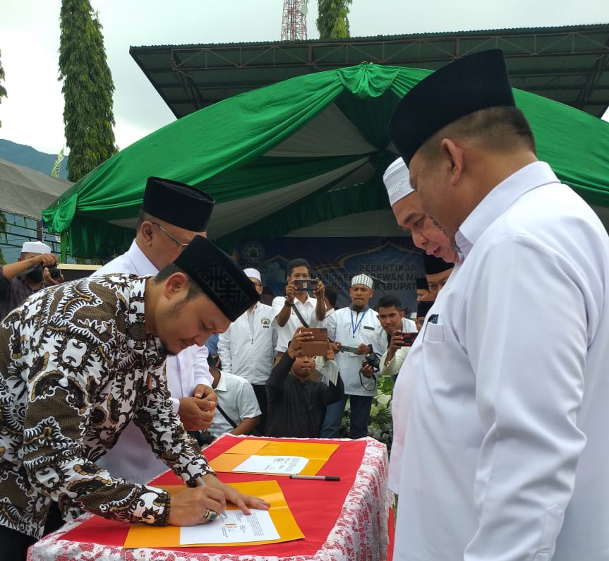 Nelwan (deadline news.com) SigiSulteng- Ketua umum (Ketum) Pimpinan Wilayah Dewan Mesjid Indonesia (PW DMI) Sulawesi Tengah Ahmad (Mat) Ali melantik ketua dan pengurus Dearah (PD DMI) Sigi, Agus Lamakarate.