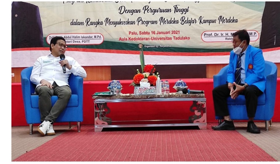Antasena (deadline-news.com)-Palusulteng-Menteri Desa, Pembangunan Daerah Tertinggal dan Transmigrasi (PDTT) Republik Indonesia (RI), Abdul Halim Iskandar, bersama rombongan melakukan kunjungan kerja ke Universitas Tadulako (Untad), Sabtu siang (16/1- 2021).