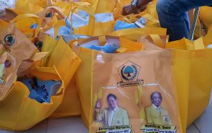 Pantauan deadline-news.com terdapat ratusan paket sembako yang siap dibagi-bagi dengan menggunakan tas kantongan warna kuning, berlogo partai Golkar dan foto Ketua Umum Partai Golkar Airlangga Hartarto serta H.Muhidin M Said. ***