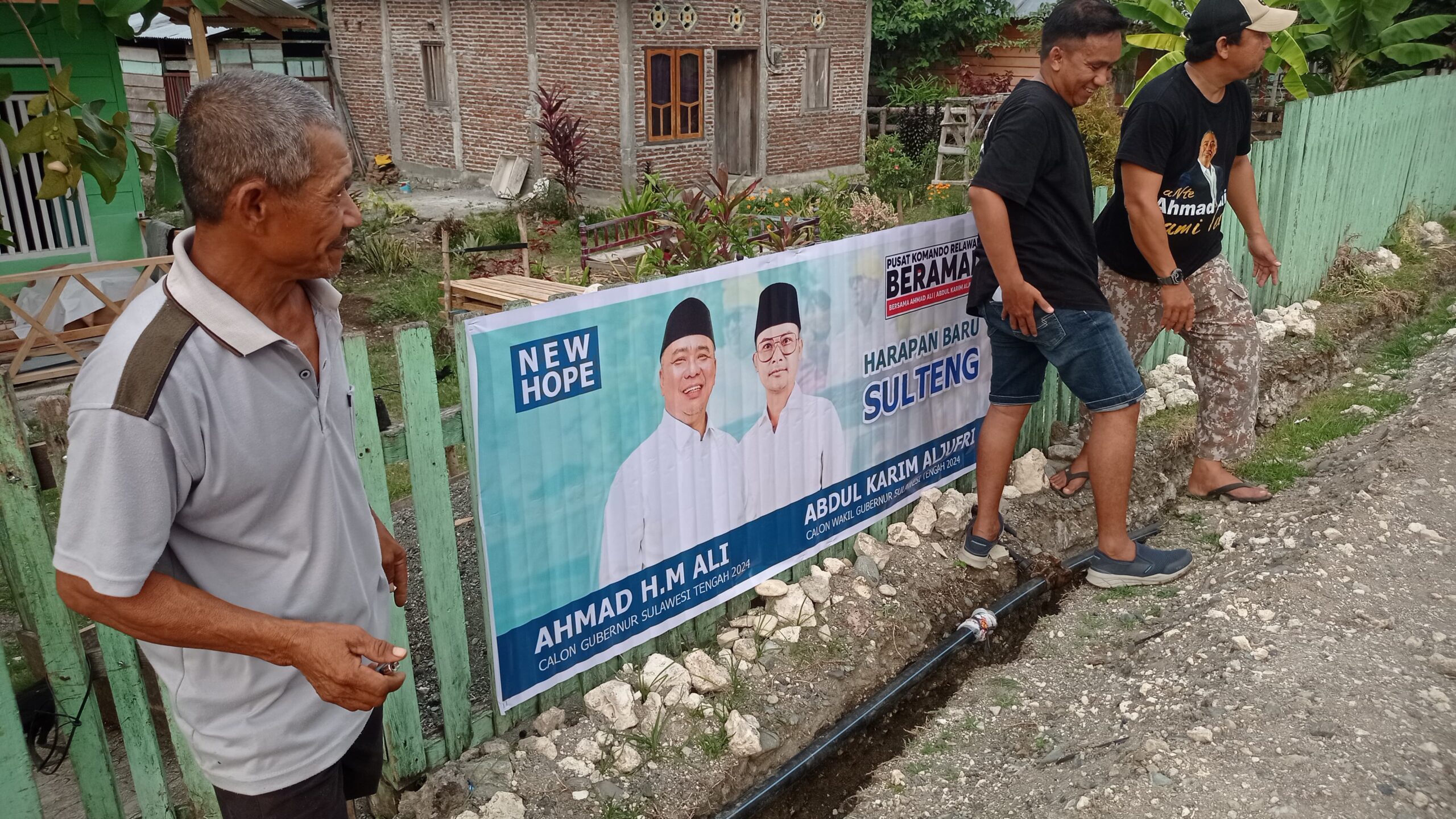 Fredy (deadline-news.com)-Banggai-Sejumlah warga Desa Tongkonunuk, Kecamatan Pagimana, Kabupaten Banggai memasang spanduk dukungan terhadap pasangan Bersama Ahmad Ali-Abdul Karim Aljufri (BERAMAL).
