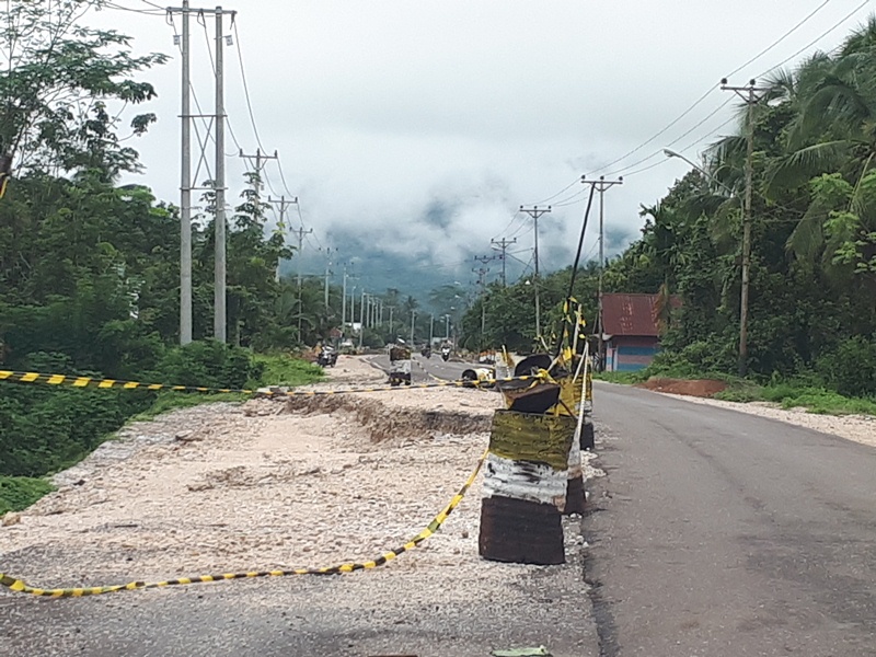Bukan itu saja, tapi sejumlah ruas jalan sudah mulai amblas. Padahal baru saja dilakukan pengerasan. Sebut saja ruas jalan nasional yang berada di wilayah Desa Kolaka Kecamatan Mori Atas mengalami amblas sekitar 20 meter. Sehingga kendaraan yang berpapasan harus ada yang mengalah.