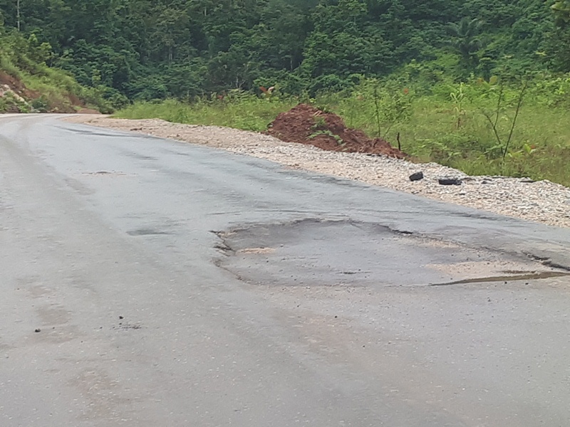 Diduga karena kwalitas aspalnya kurang bagus, sehingga belum dimakan waktu, badan jalan ruas Tomata – Beteleme itu sudah mulai bolong-bolong, sampai-sampai ditancapkan kayu ditengah jalan itu.