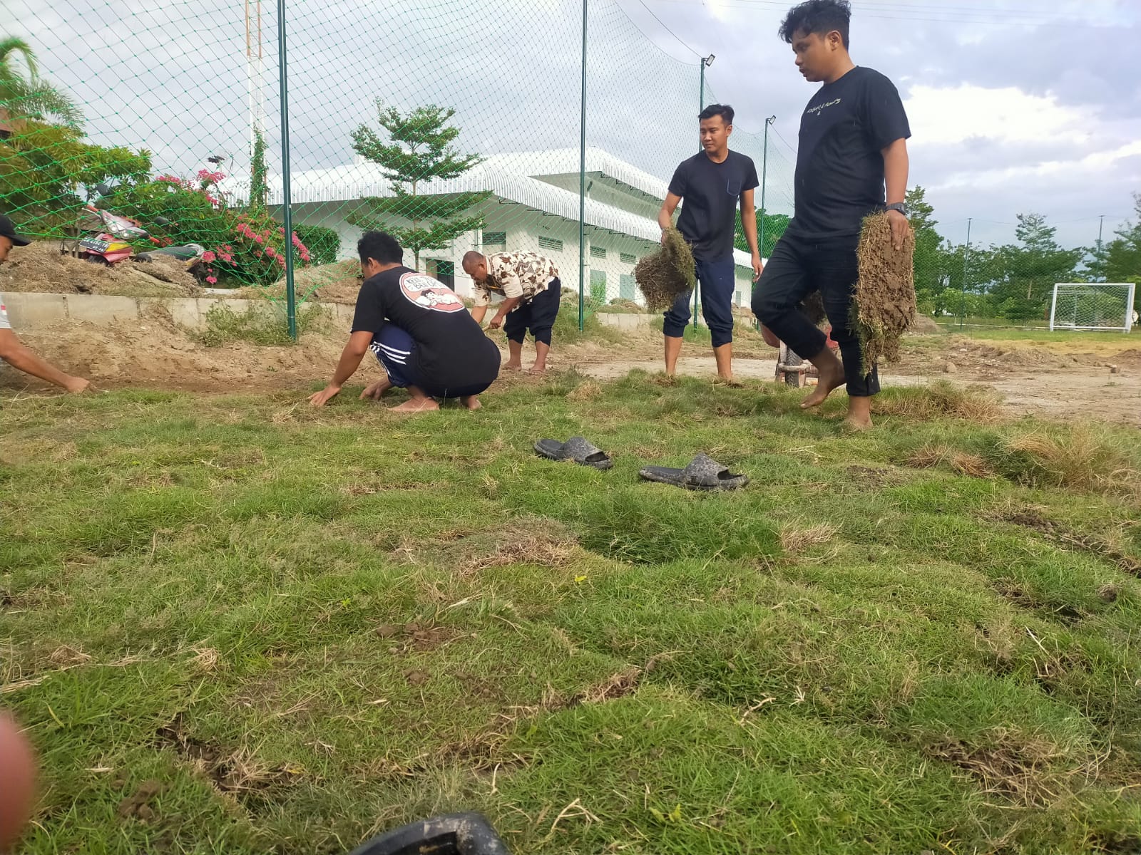 Mulai dari mengangkat dan menanam rumput, meratakan timbunan, hingga menyiram timbunan dan rumput mini soccer yang baru ditanam. Ada bahkan yang bekerja masih mengenakan baju dinas bandara.