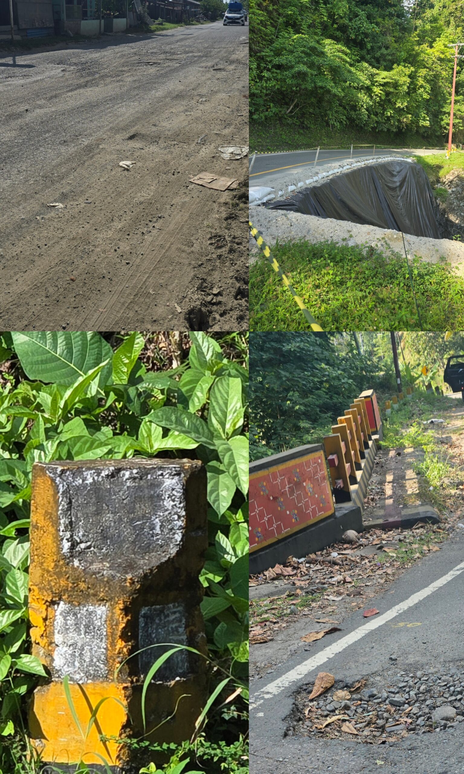 Bukan hanya badan dan bahu jalan yang rusak, tapi termasuk patokan marka jalan kilometer tak ada lagi angkanya dan catnya sudah pudar dimakan usia.