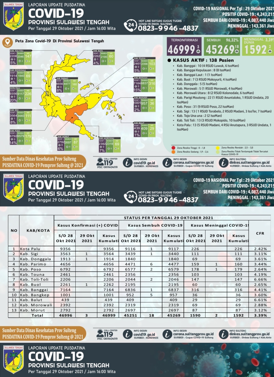 Sedangkan yang terkonfirmasi positif covid19 hari ini Jum’at (29/10-2021), sesuai data Pusdatina Covid19 Sulteng hanya ada 3 kasus berdasarkan daerah kota dan Kabupaten masing-masing se Sulteng sebagai berikut: