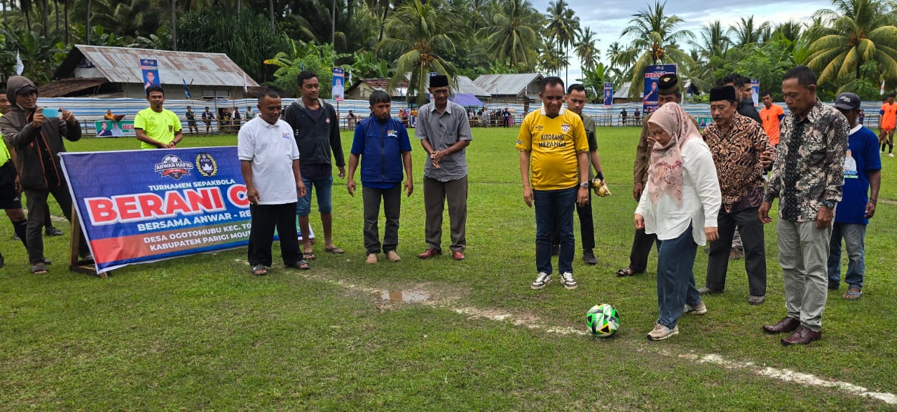 Bang Doel (deadline-news.com)-Tomini-Bakal Calon Gubernur dan wakil Gubernur Sulteng, Dr. Anwar Hafid, M.Si – dr.Reny A Lamadjido, M.Kes membuka secara resmi turnamen sepak bola BERANI CUP 2024 di Lapangan Sepak Bola Desa Ogotomubu, Kecamatan Tomini, Kabupaten Parigi Moutong (Pamong), Selasa sore (27/8-2024).
